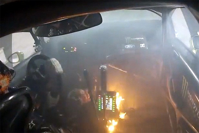 Já na primeira volta do percurso é possível ver fumaça saindo do console central de seu carro. Na liderança, com o passar do tempo a coisa só piora, cada vez com mais fumaça no cockpit. Até que, na quinta volta, há um princípio de incêndio ao lado da perna direita do piloto. Não que isso seja suficiente para pará-lo, pois ele segue correndo. Só quando sua caixa de câmbio derrete e impossibilita a troca de marchas que Block desiste e sai do carro. (Veja vídeo abaixo)