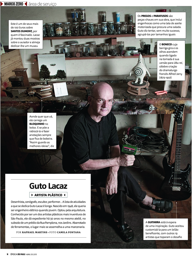 Época SÃO PAULO | Área de Serviço – Guto Lacaz 10 de abril de 20132 de agosto de 2016 / Raphael Martins * Publicado na edição 59 (Abril) da Revista Época SÃO PAULO – Editora Globo Compartilhe isso: Compartilhar no X(abre em nova janela) 18+ Compartilhar no Facebook(abre em nova janela) Facebook Curtir Carregando... Relacionado
