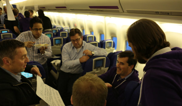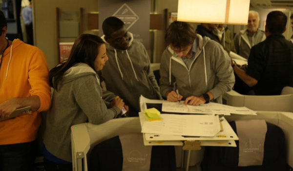 John Mc Donald: Uma das maiores reclamações deles são as interrupções de brainstorms ou compromissos que atrasam o processo. Em um avião você não pode sair, não vai usar smartphones, o que ajuda a manter o foco e, além disso, você tem um deadline muito específico, o momento do pouso. A junção de um deadline apertado e o ambiente do avião que te mantem concentrado na colaboração de forma muito intensa era uma situação inédita para todos.