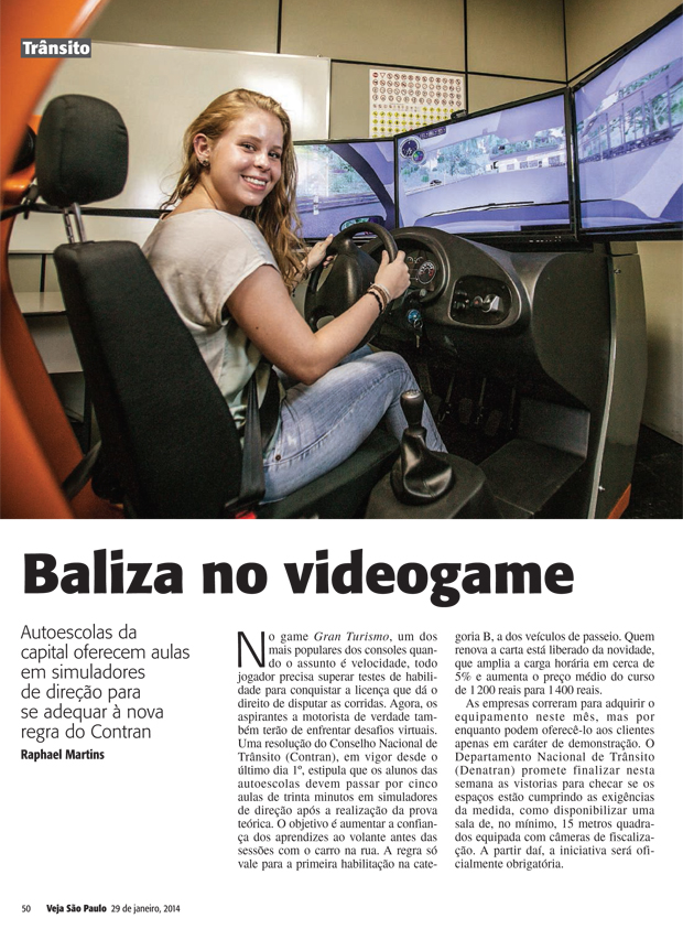 No game Gran Turismo, um dos mais populares dos consoles quando o assunto é velocidade, todo jogador precisa superar testes de habilidade para conquistar a licença que dá o direito de disputar as corridas. Agora, os aspirantes a motorista de verdade também terão de enfrentar desafios virtuais. Uma resolução do Conselho Nacional de Trânsito (Contran), em vigor desde o último dia 1º, estipula que os alunos das autoescolas devem passar por cinco aulas de trinta minutos em simuladores de direção após a realização da prova teórica. O objetivo é aumentar a confiança dos aprendizes ao volante antes das sessões com o carro na rua. A regra só vale para a primeira habilitação na categoria B, a dos veículos de passeio. Quem renova a carta está liberado da novidade, que amplia a carga horária em cerca de 5% e aumenta o preço médio do curso de 1 200 reais para 1 400 reais.