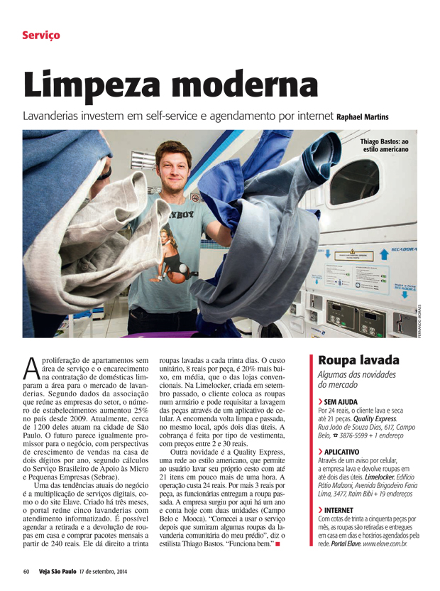 Uma das tendências atuais do negócio é a multiplicação de serviços digitais, como o do site Elave. Criado há três meses, o portal reúne cinco lavanderias com atendimento informatizado. É possível agendar a retirada e a devolução de roupas em casa e comprar pacotes mensais a partir de 240 reais. Ele dá direito a trinta roupas lavadas a cada trinta dias. O custo unitário, 8 reais por peça, é 20% mais baixo, em média, que o das lojas convencionais. Na Limelocker, criada em setembro passado, o cliente coloca as roupas num armário e pode requisitar a lavagem das peças através de um aplicativo de celular. A encomenda volta limpa e passada, no mesmo local, após dois dias úteis. A cobrança é feita por tipo de vestimenta, com preços entre 2 e 30 reais.